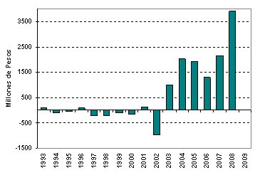 * Si se analiza la dinámica de la situación del Tesoro nacional se advierte que desde el año 1993 hasta el año 2001 tuvo un saldo promedio negativo de $52 millones (siempre considerando primer bimestre de cada año). Luego de la fuerte caída en 2002 (-$1000) el saldo se tornó positivo hasta la actualidad. Adviértase el fuerte crecimiento en los dos últimos años como producto de lo percibido en concepto de retenciones (mejores precios y mayores alícuotas). Situación que se ha revertido de manera significativa en los últimos meses.