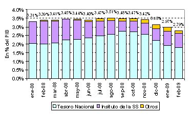 * Si bien el año recién comienza, la evolución de ingresos y gastos observada durante los últimos meses está deteriorando de manera clara el ratio superávit SPN a PIB, variable clave para determinar la capacidad de pago de los vencimientos de deuda que debe afrontar el gobierno nacional. En el acumulado de los últimos doce meses, el valor máximo se alcanzó en agosto de 2008 (3.51%), siendo que a partir de allí comenzó a descender de manera sostenida, asumiendo el acumulado anual en febrero de este año un nivel del 2.79% del PIB.