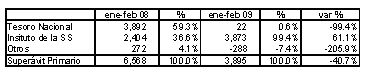 * Cambió la composición del superávit primario intra sector público, ya que ahora el aporte del Tesoro es 0,6% cuando en el primer bimestre de 2008 participaba con el 59.3%