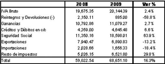 - Esta semana se conocieron las cifras de recaudación correspondiente al mes de marzo de 2009. En dicho periodo el fisco recaudó 21.765 millones de pesos, un 23,0% más que igual mes del año pasado. Esta cifra fue superior a la esperada, si se tiene en cuenta que en enero el crecimiento interanual fue de 11,0% y en febrero del 16,2%. La Tabla siguiente muestra los principales componentes de la recaudación.