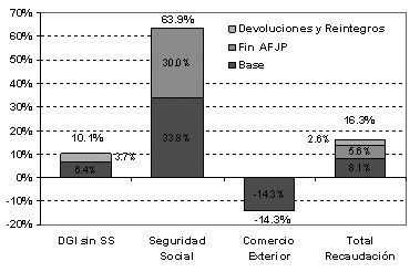 - Resulta interesante aislar los ingresos extraordinarios (fin de las AFJP, nueva política de devoluciones y reintegros) para ver cuál hubiese sido el crecimiento de la recaudación en el primer trimestre del año. El gráfico siguiente muestra esta descomposición. La recaudación bruta de la DGI creció 6,4%, por lo que la política de disminuir devoluciones y reintegros explica los 3,7 puntos porcentuales restante de crecimiento en el periodo (10,1%). Con respecto al la seguridad social el impacto es mayor, casi la mitad del crecimiento (30%) se explica por la eliminación del subsistema privado de jubilaciones. En resumen, si se excluyen estos elementos extraordinarios la recaudación del primer trimestre no llega a la mitad de la informada oficialmente (8,1% versus 16,3%).