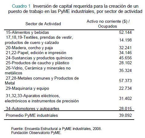 Las estadísticas elaboradas por la Fundación Observatorio PyME mediante la genuina colaboración de miles de empresarios pequeños y medianos de todo el país, permitió calcular que hasta el tercer trimestre de 2008, fueron 13.700 los puestos de trabajos destruidos en el sector. Crear dichos puestos de trabajo había requerido oportunas inversiones en los distintos sectores, desde $14.200 en el sector Textiles, prendas de vestir y productos de cuero y calzado, hasta $57.500 en el sector Metales comunes y productos de metal que ahora quedarán ociosas (Ver Cuadro 1).