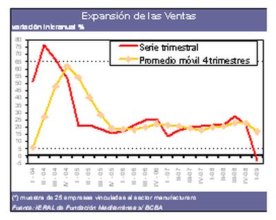 - A la derecha, el gráfico es más que elocuente y refleja que, por primera vez desde 2004, este conjunto de firmas ha tenido un resultado neto negativo. Si se analiza el promedio móvil de cuatro trimestres, la caída en el ratio no es menor: se pasa de 13,2% a fines de 2008 a 7,2% entre enero y marzo de este año.