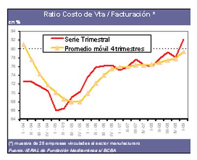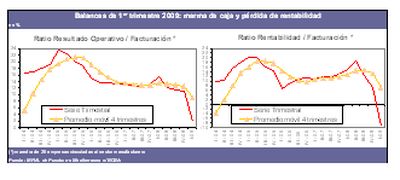 - De hecho, ya el primer trimestre del año evidencia el estrechamiento de caja y la pérdida de rentabilidad de las empresas. Como muestra el gráfico de la izquierda, el ratio resultado operativo / facturación descendió a 1,8% este año, muy por debajo del 15,3% registrado en igual período de 2008 y similar al nivel de fines de 2001.