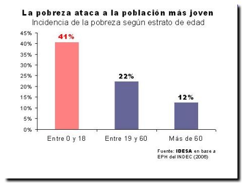Los datos muestran claramente que las diferencias entre grupos etáreos son muy profundas, al punto tal que la incidencia de la pobreza entre los niños y adolescentes es más de tres veces superior a la incidencia de la pobreza entren las personas mayores de 60 años. Esto hace que prácticamente la mitad de los pobres sean niños o adolescentes. La concentración de la pobreza entre los menores tiene consecuencias muy graves porque el daño que la marginación provoca en el desarrollo físico, intelectual y social de una persona se potencia cuando actúa en los primeros años de la vida.