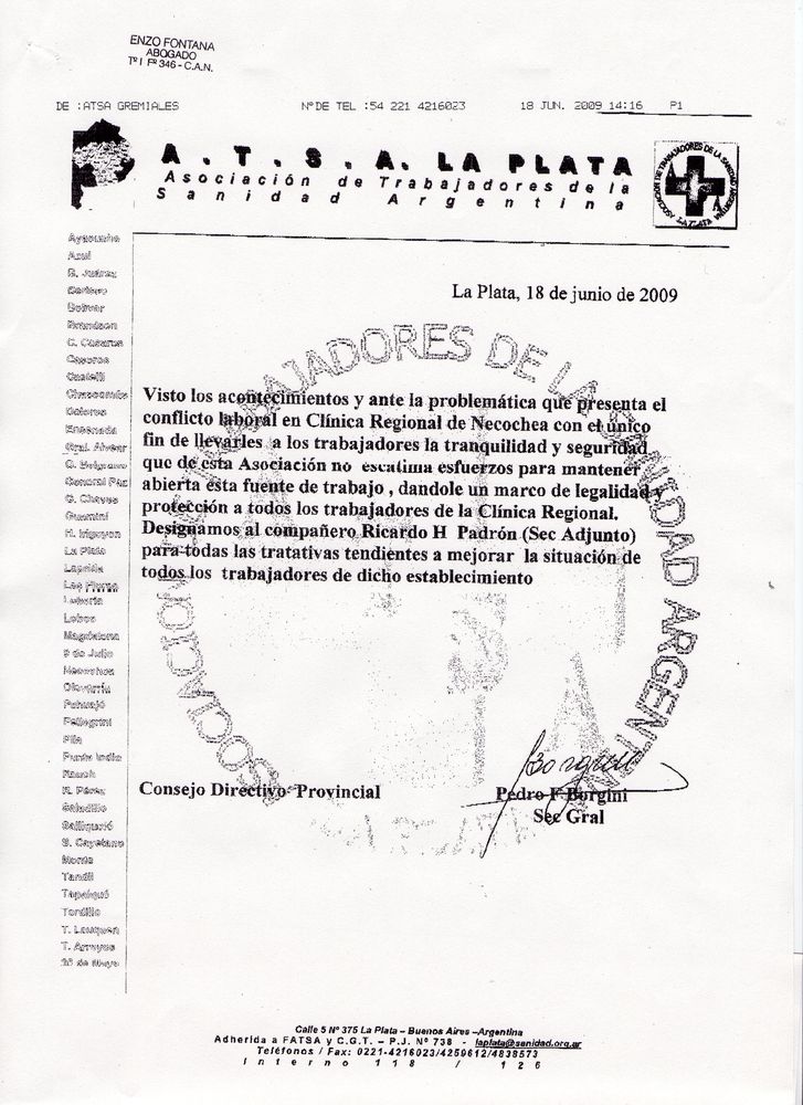 Quienes integramos el “Grupo de Trabajadores de la Clínica Regional en Defensa de sus Derechos”, comunicamos que el Secretario General de ATSA ha dispuesto encomendar de manera Directa al Secretario Adjunto de dicho sindicato la intervención y gestión del conflicto que la Clínica Privada Regional mantiene con todos sus empleados. Por ello, habiéndose conseguido el objetivo por el cual se dispuso la toma absolutamente pacifica de esta Sede Sindical, el cual era que se apartara al Sr. Fabio Echavez de la conducción de la problemática que mantenemos con Clínica Privada Regional S.A. hemos finalizado en el día de la fecha con dicha medida de fuerza.-