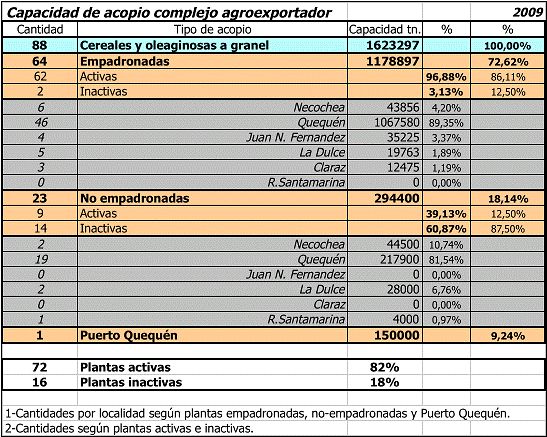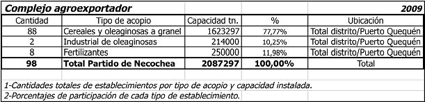La capacidad de acopio de cereal y oleaginosas total de las 88 plantas localizadas en el distrito asciende a 1.623.297 toneladas, representa un 80% más del identificado por la Municipalidad de Necochea al año 2007.