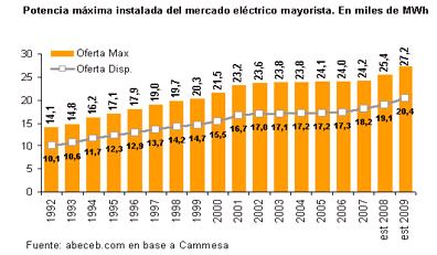 El sistema eléctrico presenta una potencia instalada que permanece prácticamente fija desde 2002. Dos problemas son los que enfrenta principalmente el sector: Por un lado, desde hace unos años la capacidad instalada se mantiene al máximo de su utilización. A este aspecto confluye el aumento del nivel de actividad a partir de 2002, que lleva a una mayor demanda, y las menores inversiones del sector, que mantienen casi invariable la oferta. Vale aclarar, sin embargo, que producto de las inversiones privadas y públicas, el año pasado se agregaron 2.204 MW de potencia al mercado. Por otro lado, las tarifas del consumo eléctrico se han estancado desde la devaluación, favoreciendo la demanda pero con un efecto de desincentivo sobre las inversiones y la ampliación de la oferta. En octubre de 2008 se dispuso el primer ajuste de tarifas residenciales desde 2002. Sin embargo, todavía los precios distan de los de la región.
