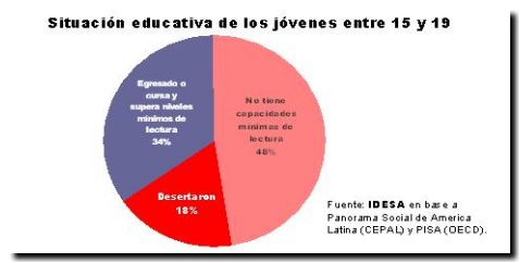 Según la CEPAL, en la Argentina el 18% de los jóvenes de entre 15 y 19 desertó de la educación (y otro 15% está muy retrasado). Por otro lado, según la evaluación PISA el 58% de los alumnos de 15 años no tienen capacidades mínimas de lectura, un requisito básico para desempeñarse con relativo éxito en el mercado de trabajo. Esto quiere que decir que aproximadamente 2 de cada 3 jóvenes no llega a terminar la secundaria o no tiene capacidades mínimas de lectura para incorporarse productivamente en el mercado laboral.