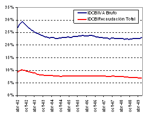 - En la estructura de financiamiento tributario argentinos el IDCB no es un impuesto de menor importancia, ya que equivale al 23% del producido por el IVA (principal impuesto) y su participación en el total de la recaudación nacional es del 7%. Como muestra el siguiente gráfico, esta participación muestra estabilidad, esto es, el impuesto sigue un comportamiento similar al promedio de los tributos. Esto se explica porque la mayoría de los impuestos (además de IVA y el IDCB) están relacionados con la actividad económica.