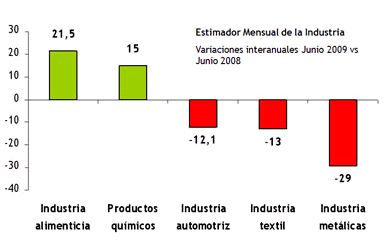 Para el mes de junio, la producción manufacturera en términos estacionalizados muestra incrementos del 0,6% respecto al mismo mes del año pasado, constituyendo el sexto mes consecutivo en el que se observan caídas interanuales de la producción industrial. En cambio, si se comparan los datos con el quinto mes del corriente año, se observa que el sector se contrajo un 0,6% en la medición sin estacionalidad. De esta manera, para el primer semestre del año, la industria acumula una caída del 1,4%. Entre los sectores que más impulsaron el alza en junio aparece la industria alimenticia que presentó un crecimiento interanual igual a 21,5%. Al interior de este sector, la molienda de cereales y oleaginosas presentó el alza de mayor magnitud, siendo esta igual a 43,9%. Este crecimiento se corrobora con el dato publicado por la Cámara de la Industria Aceitera en la República Argentina (CIARA) para la molienda de oleaginosas. El mismo fue igual a 47,8%. Carnes Rojas también impulsó el crecimiento de la industria alimenticia al registrar una variación positiva igual a 38,6%. Productos químicos, de caucho y plástico constituye el otro sector que empujó al alza a la industria en el sexto mes del año al crecer un 15% respecto a junio del 2008. Por otro lado, los sectores que contribuyeron a la contracción de la producción manufacturera fueron la industria automotriz y las industrias metales básicas. La primera cayó un 12,1% en forma interanual, acumulando para el primer semestre del año una merma igual al 27,8%. La segunda lo hizo en mayor magnitud: -29%, siendo el acero crudo el subsector de mayor contracción (-35,8%)