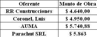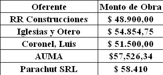 Para esta obra se presentaron cinco oferentes que ofertaron lo siguiente: