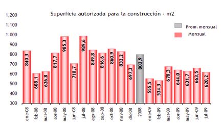 Mientras en algunos sectores de la economía se comienza a observar un tibio repunte de la actividad, como es el caso de los comercios minoristas; el sector de la construcción se encuentra lejos de cambiar la tendencia negativa que muestra a lo largo de todo el 2009. De hecho, el mes de julio presentó la caída interanual más fuerte del último año, retrocediendo un 6,9% (con estacionalidad) respecto de julio de 2008. No obstante, este dato se explica en parte por el fuerte crecimiento del sector en el mes de julio del año pasado. Si se compara la evolución de este sector respecto del mes anterior, se observa un crecimiento del 0,9% (sin estacionalidad), luego de dos meses de retroceso. Sin embargo, a pesar de este resultado positivo no se puede hablar de una tendencia alcista. En lo que va del 2009, el sector de la construcción acumula un retroceso de 2,8% con respecto a los siete primeros meses del 2008. En lo que respecta a los diferentes bloques que componen al sector, excepto las obras viales que crecieron un 7,7%, todos presentaron caídas respecto del mismo mes del año anterior. Entre ellos, se destacan las construcciones petroleras, que retrocedieron un 50,1%. Otro dato relevante es el cambio brusco de las obras de infraestructura, que en junio tuvieron un crecimiento de 10,5% interanual, y en el mes de julio la caída llegó a 8,2%. Este cambio se explica por el fuerte crecimiento de este bloque en los meses previos a las elecciones del 28 de junio. Por su parte, la perspectiva para el sector no es muy alentadora, ya que la superficie cubierta a construir, que figura en los permisos de edificación de una nómina de 42 municipios, presenta una caída de 37% respecto de julio de 2008 con una superficie de 620.230 m2, cayendo por debajo del promedio mensual de los últimos cinco meses.