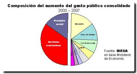 Según esta fuente oficial, entre los años 2000 y 2007 el gasto público consolidado, neto de pago de deuda, creció en términos reales aproximadamente un 40%. Las principales finalidades hacia las que se canalizó este aumento del gasto público fueron: