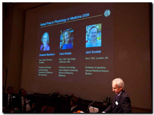 El premio Nobel de Medicina 2009 fue otorgado a tres científicos en Estados Unidos, Elizabeth Blackburn, Carol Greider y Jack Szostak, por su trabajo sobre el envejecimiento de las células y su relación con el cáncer.