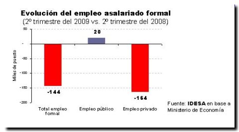 Si bien los datos son preliminares y están sujetos a revisión (lo más probable es que sea al alza), la información sugiere una dinámica laboral en el sector formal muy negativa. Particularmente importante es el intenso proceso de destrucción de empleos entre las empresas privadas. Lamentablemente no se cuenta con estadísticas confiables para compararlos con la desaceleración en el nivel de actividad económica. De todas formas, según el Indicador Mensual de Actividad Económica del INDEC, la reducción en la producción en el 2º trimestre del 2009 habría sido de aproximadamente -1%. Aun suponiendo que la caída haya sido mayor, es evidente que resulta insuficiente para explicar una destrucción tan acelerada en el nivel de empleo formal privado.
