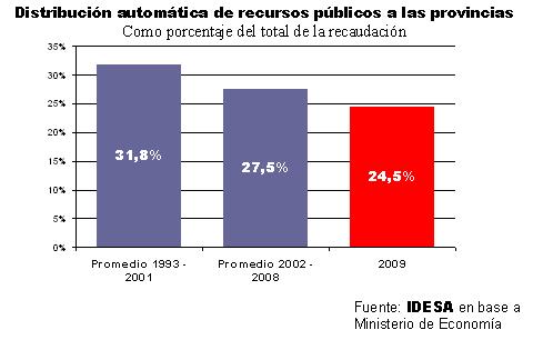 - En lo que va del 2009, los recursos de transferencias automáticas a las provincias vuelven a caer y representan apenas el 24% del total de la recaudación.