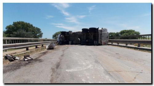 «Alrededor de las 13 y 15 horas, desde la rotonda de Cargill y en el ingreso del puente, se produce el incidente con una camioneta Kangoo Renault que hizo una mala maniobra y provocó el vuelco de un camión con fertilizantes», relató el director de Defensa Civil, Ariel Paniagua.