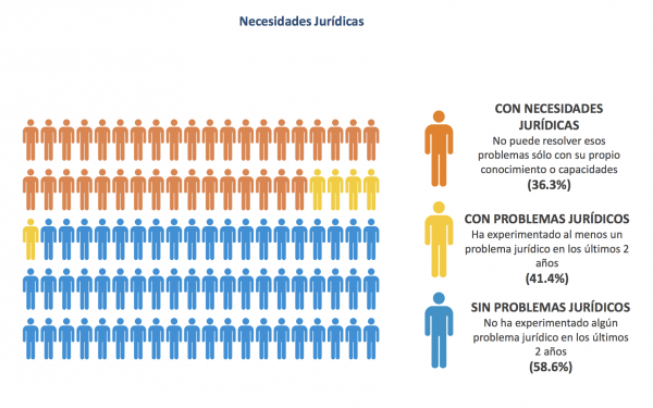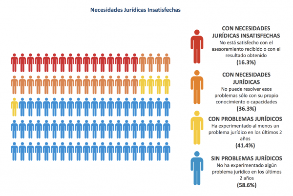 De acuerdo a la Encuesta de necesidades jurídicas insatisfechas, entre 2016 y 2019 aumentó la percepción de que el origen de los problemas de las necesidades jurídicas insatisfechas reside, en primer lugar, en «vivir en un país injusto”, y en segundo lugar, en la falta de trabajo o «problemas en el trabajo».