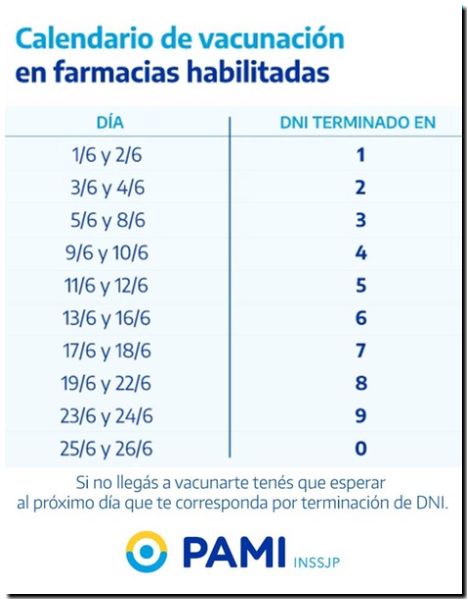 Será conforme al cronograma de aplicación fijado unilateralmente por el Instituto Nacional de Servicios Sociales para Jubilados y Pensionados (INSSJP), tomando en cuenta el último número del DNI/LE/LC de los afiliados y afiliadas de PAMI para la asignación de sus respectivas fechas de vacunación: