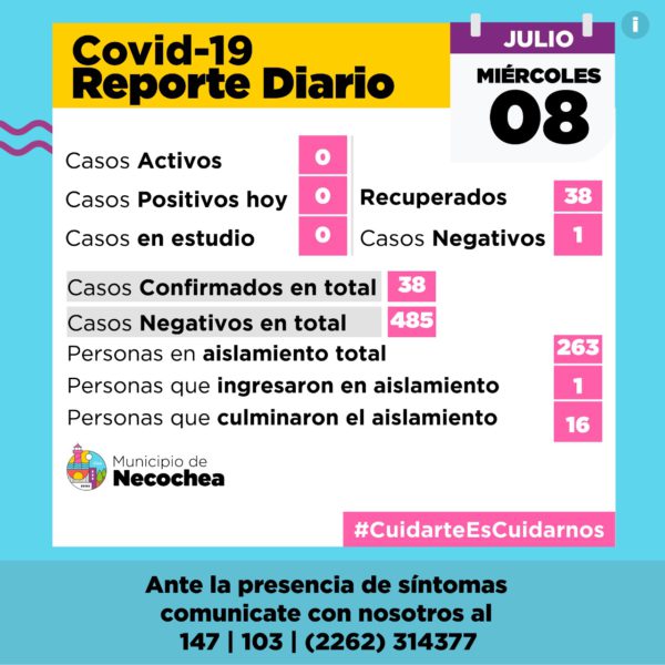 De esta manera, nuestro Distrito no tiene casos activos de Coronavirus en estos momentos, como tampoco sospechosos, según el informe diario enviado hace minutos. Asimismo, cabe señalarse que hay 263 personas en aislamiento preventivo.