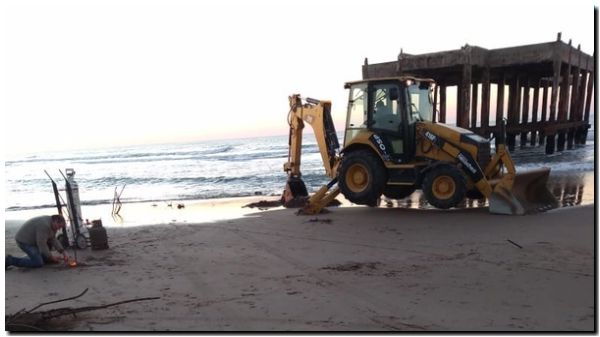 Durante el fin de semana se aprovechó la marea baja de la madrugada para seguir extrayendo hierros y vigas a mano y con retropala, y seguirán esta semana.