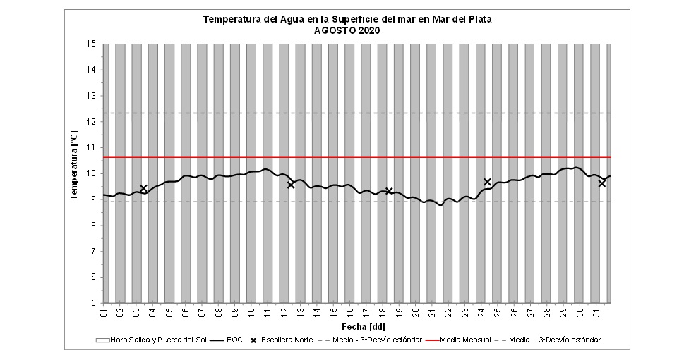 El Gabinete de Oceanografía Física del Instituto Nacional de Investigación y Desarrollo Pesquero (INIDEP) informó la temperatura del agua registrada en la superficie del mar en Mar del Plata durante el mes de agosto.